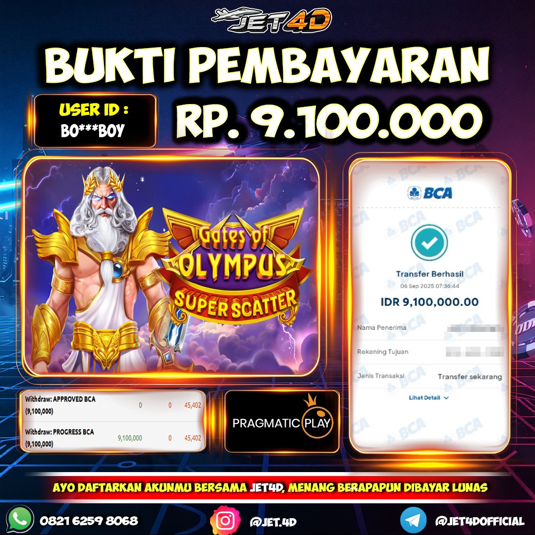 JET4D HUJAN PETIR KAKEK ZEUS Selamat Kepada Member Setia Atas Withdraw Rp 9.100.000 Hari ini. List member yang sebelumnya mendapatkan withdraw besar bisa cek Disini dan di LINK ini.pelanyanan nonstop