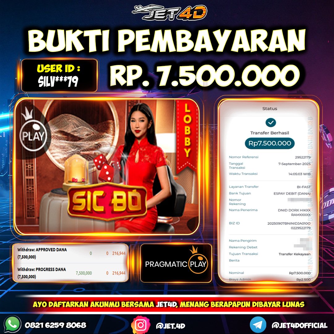 JET4D LIVE CASINO #1 ASIA Selamat Kepada Member Setia Atas Withdraw Rp 7.500.000 Hari ini. List member yang sebelumnya mendapatkan withdraw besar bisa cek Disini dan di LINK ini.pelanyanan nonstop