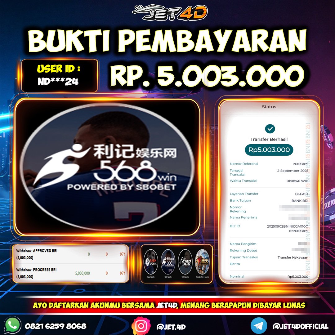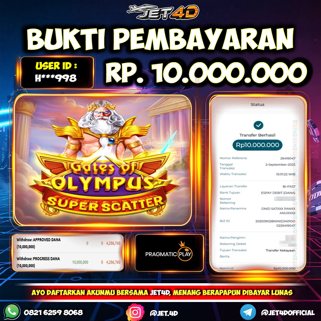 JET4D HUJAN PETIR AUTO WD Selamat Kepada Member Setia Atas Withdraw Rp 10.000.000 Hari ini. List member yang sebelumnya mendapatkan withdraw besar bisa cek Disini dan di LINK ini.pelanyanan nonstop