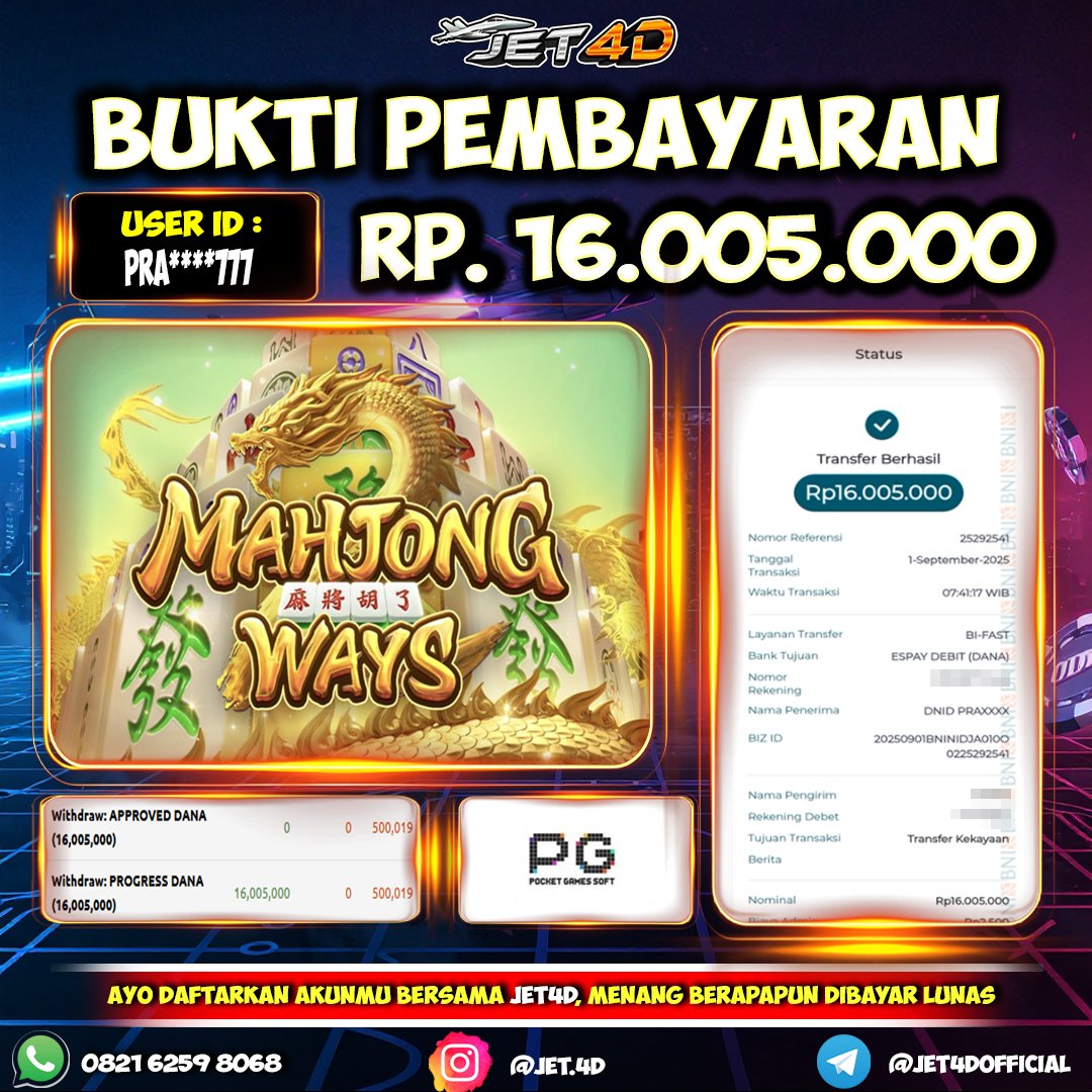 JET4D MAHJONG TERGACOR #1 Selamat Kepada Member Setia Atas Withdraw Rp 16.005.000 Hari ini. List member yang sebelumnya mendapatkan withdraw besar bisa cek Disini dan di LINK ini.pelanyanan nonstop dan