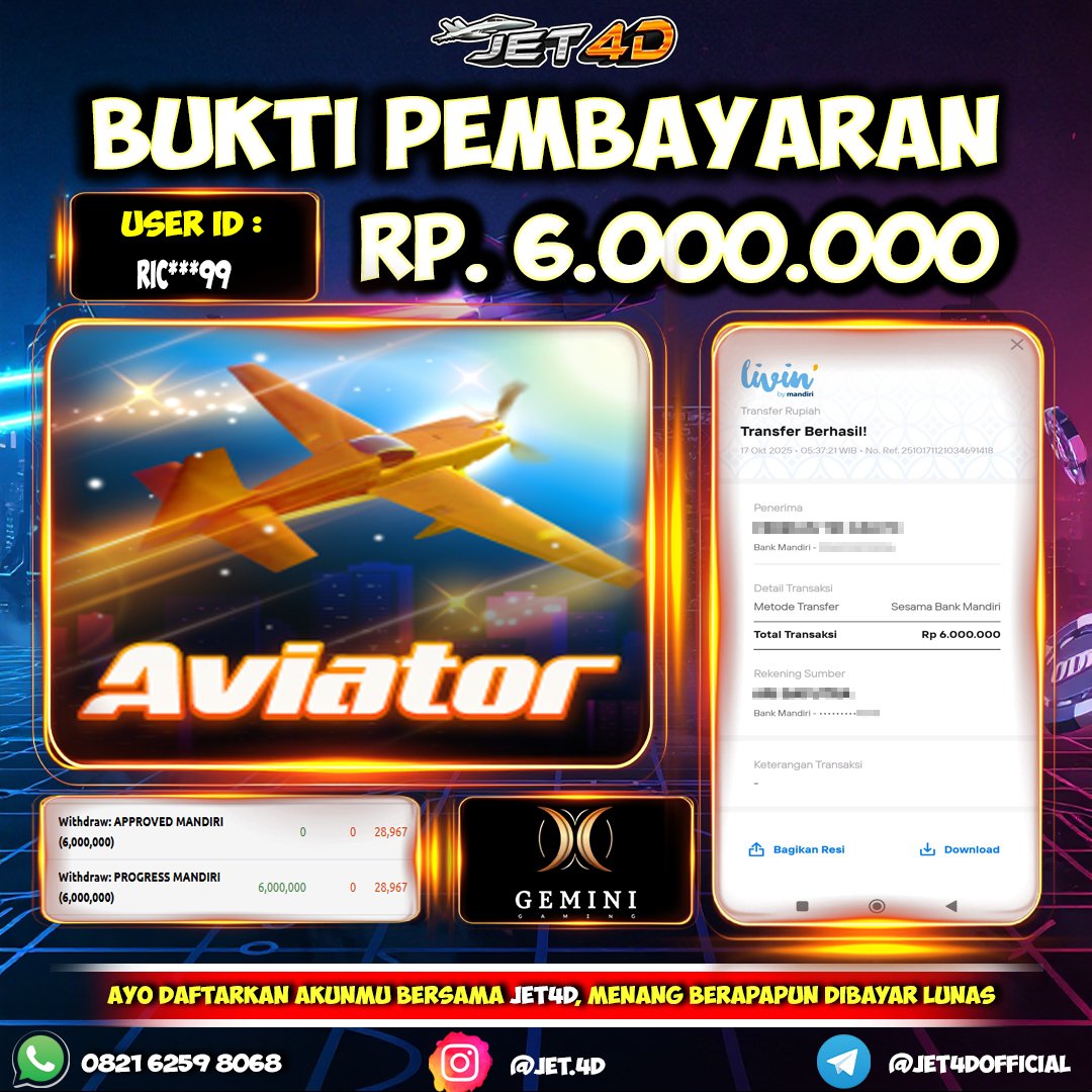 JET4D MENANG BESAR di DUNIA AVIATOR Selamat Kepada Member Setia Atas Withdraw Rp 6.000.000 Hari ini. List member yang sebelumnya mendapatkan withdraw besar bisa cek Disini dan di LINK ini.pelanyanan
