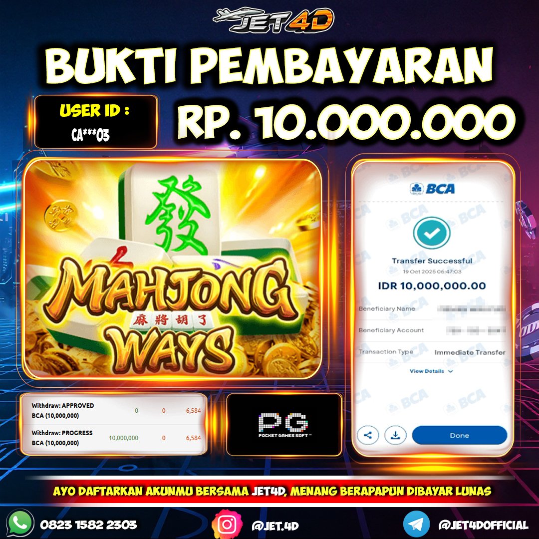 JET4D MAHJONG TERGACOR HANYA DISINI Selamat Kepada Member Setia Atas Withdraw Rp 10.000.000 Hari ini. List member yang sebelumnya mendapatkan withdraw besar bisa cek Disini dan di LINK ini.pelanyanan nonstop