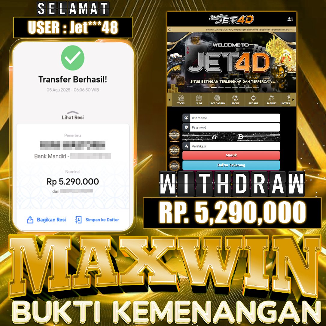 JET4D EVENT MAX PARLAY Selamat Kepada Member Setia Atas Withdraw Rp 40.000.000 Hari ini. List member yang sebelumnya mendapatkan withdraw besar bisa cek Disini dan di LINK ini.pelanyanan nonstop dan profesional