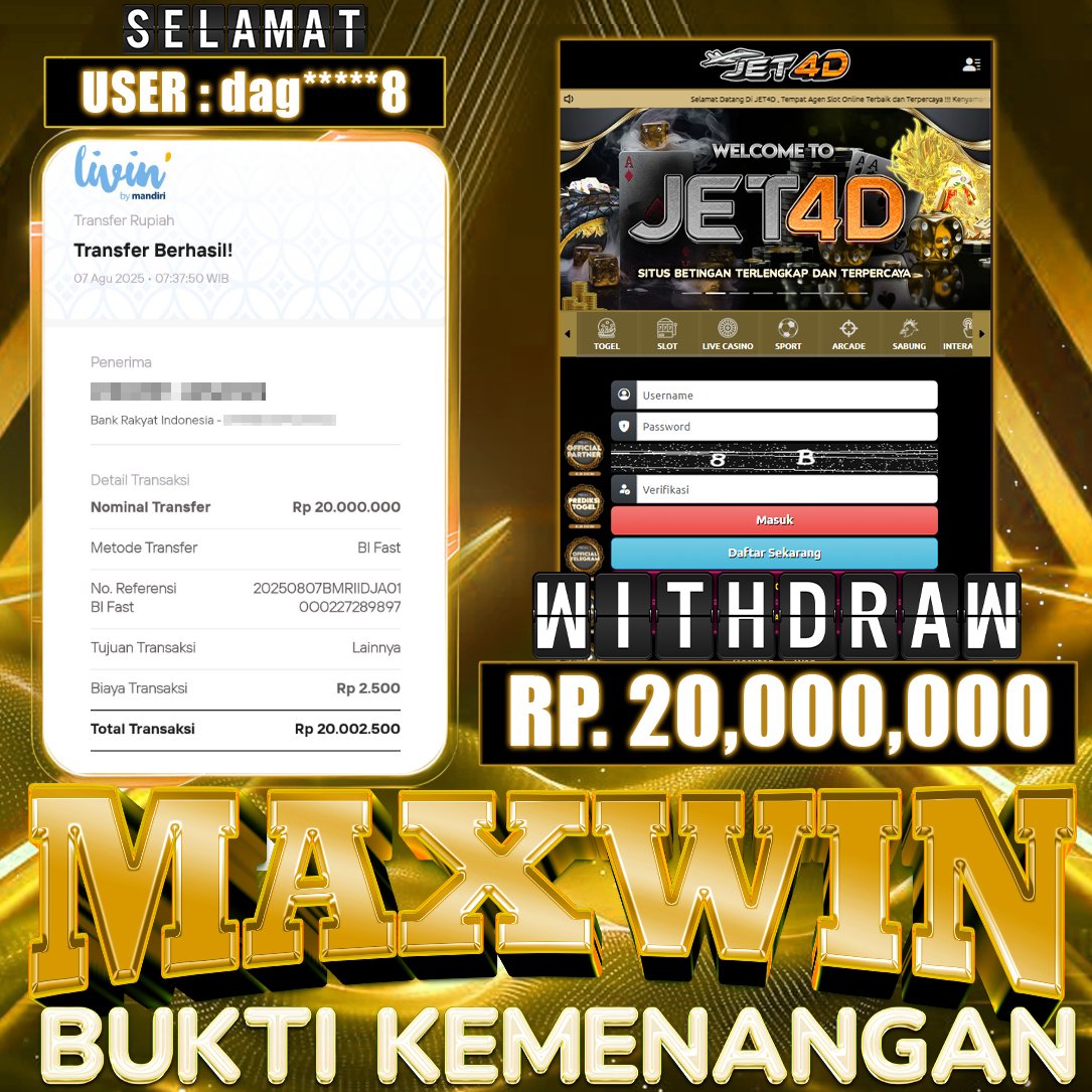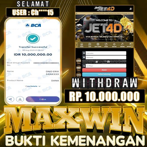 JET4D MODAL BERAPA PUN PASTI JP PAUS Selamat Kepada Member Setia Atas Withdraw Rp 10.000.000 Hari ini. List member yang sebelumnya mendapatkan withdraw besar bisa cek Disini dan di LINK ini.pelanyanan