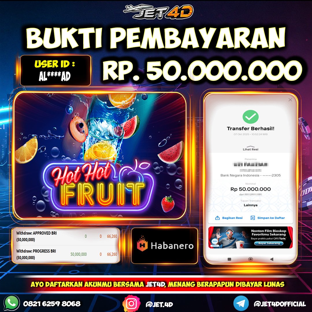 JET4D JACKPOT BUAH PANAS Selamat Kepada Member Setia Atas Withdraw Rp 50.000.000 Hari ini. List member yang sebelumnya mendapatkan withdraw besar bisa cek Disini dan di LINK ini.pelanyanan nonstop dan