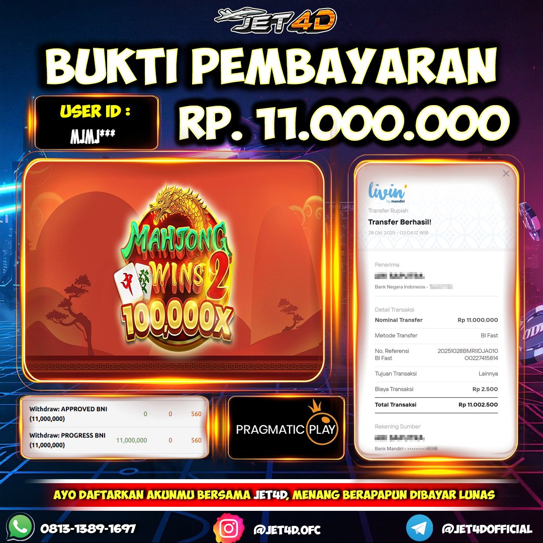 JET4D KEMENANGAN DARI NEGERI TIONGKOK Selamat Kepada Member Setia Atas WithdrawΒ Rp 11.000.000 Hari ini.
