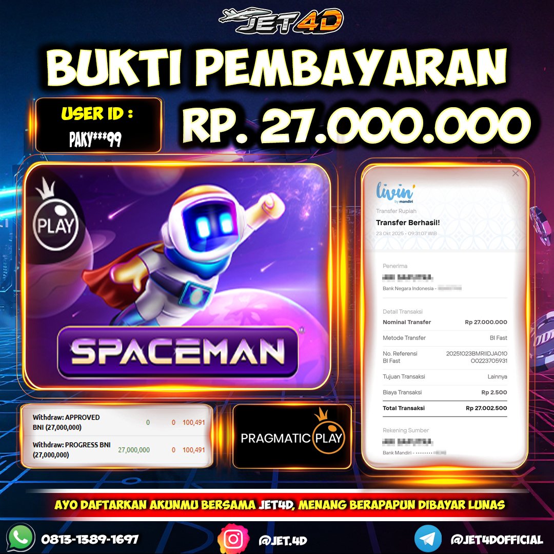 JET4D TERBANG BERSAMA SPACEMAN Selamat Kepada Member Setia Atas Withdrawย Rp 27.000.000 Hari ini.